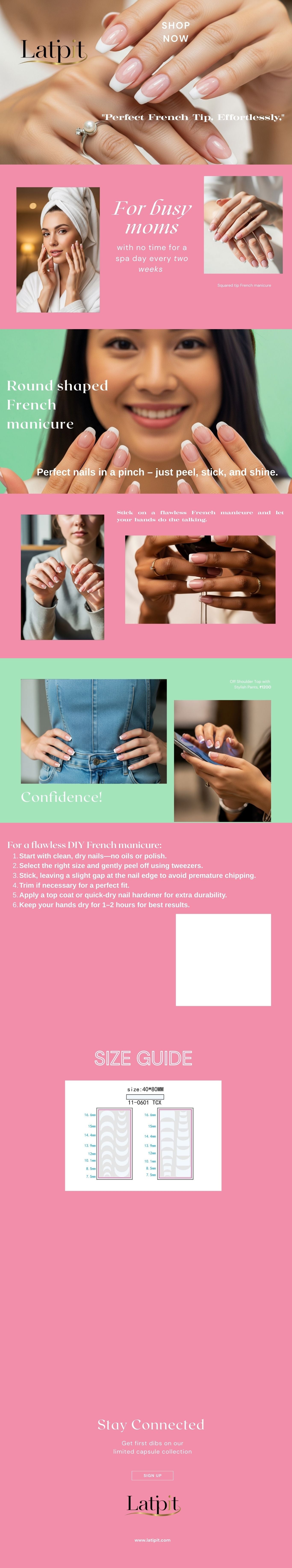 Spend less time at the salon and more time enjoying perfect nails. LaTipit gives you professional French tips—fast, affordable, and long-lasting.